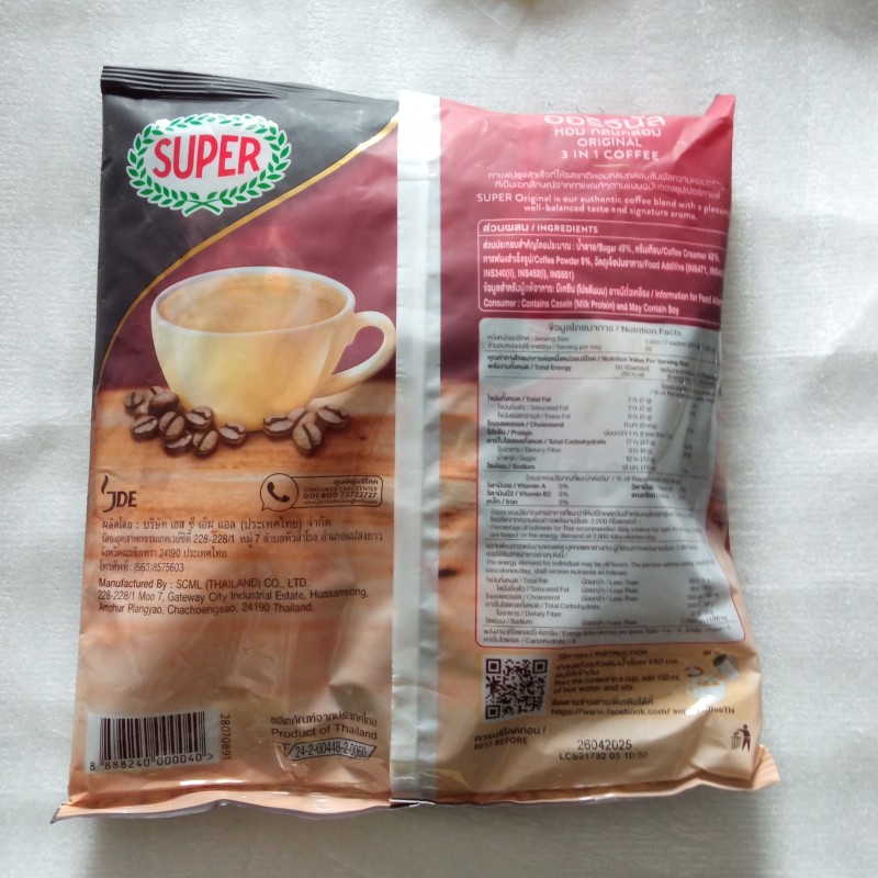 กาแฟปรุงสำเร็จชนิดผงตรา ซุปเปอร์ รสออริจินอล ผลิตจากกาแฟพันธุ์ดี ผ่านการคัดสรรด้วยเครื่องที่ทันสมัยและได้มาตรฐาน มีรสชาติหอมกลมกล่อม ตามแบบต้นฉบับกาแฟ