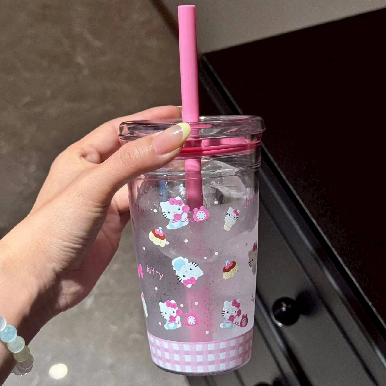 แก้วน้ำพลาสติก คิตตี้มีฝาปิดพร้อมหลอด