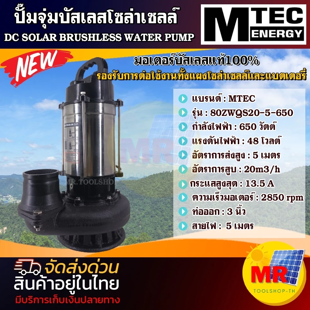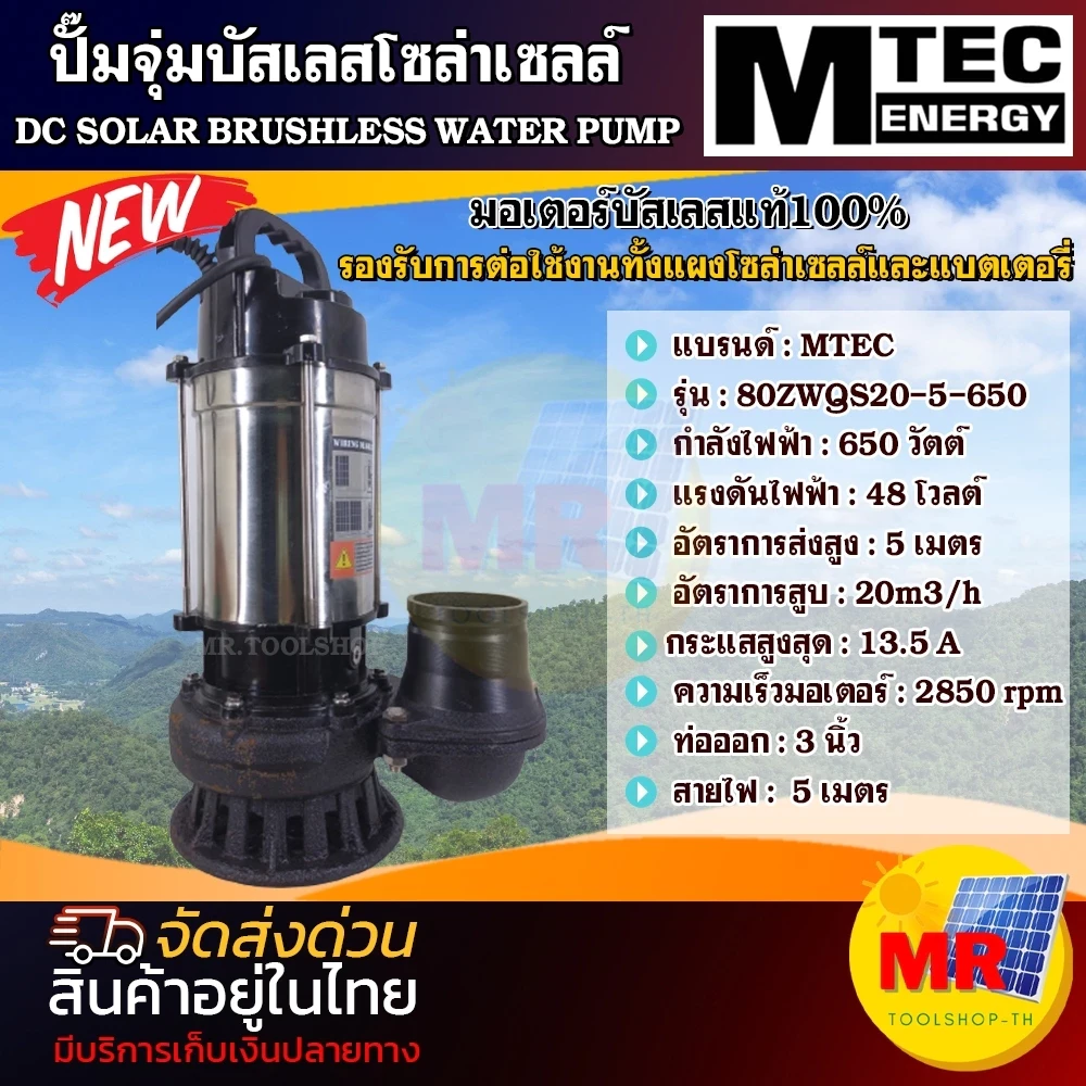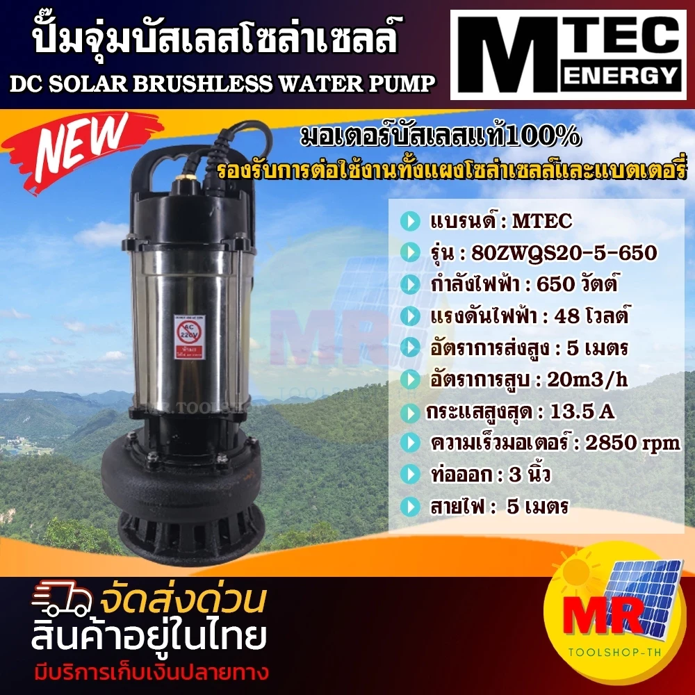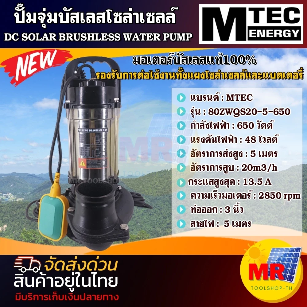 MTEC ปั๊มจุ่มโซล่าเซลล์ ปั๊มน้ำ รุ่น 80ZWQS20-5-650 650W 48V ติดลูกลอย มอเตอร์บัสเลสแท้ 100% ต่อตรงโซล่าเซลล์ 48V